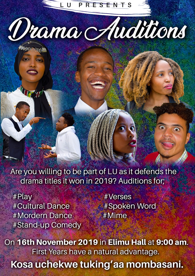 Laikipia University students will audition for the 2020 Kenya National Drama and Film Festival on Saturday 16th November 2019 at 9.00 a.m. in Elimu Hall. The students will audition for the following items: Play, cultural creative dance, mime, solo verse, spoken word, narrative, modern dance and stand-up comedy. Students who wish to hone their theatrical skills and those willing to be part of LU as it defends the titles it won in 2019 are welcome. First Year students are encouraged to participate. There will be experienced adjudicators for the exercise.